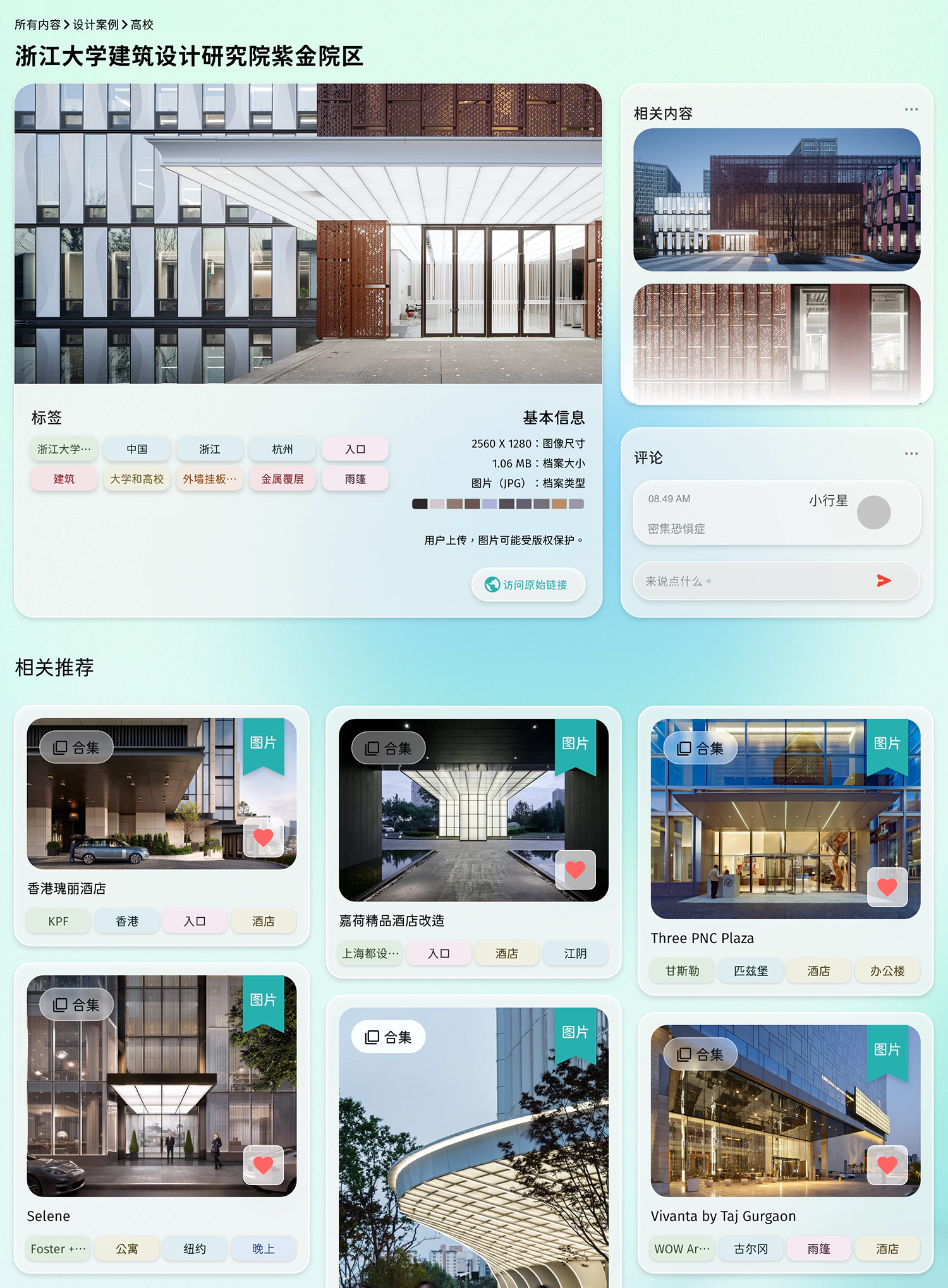 快速找到更多相似风格的灵感。在内容详情页中,系统会基于当前素材,智能推荐更多相关参考与资源,运用 AI 分析提供精准匹配。